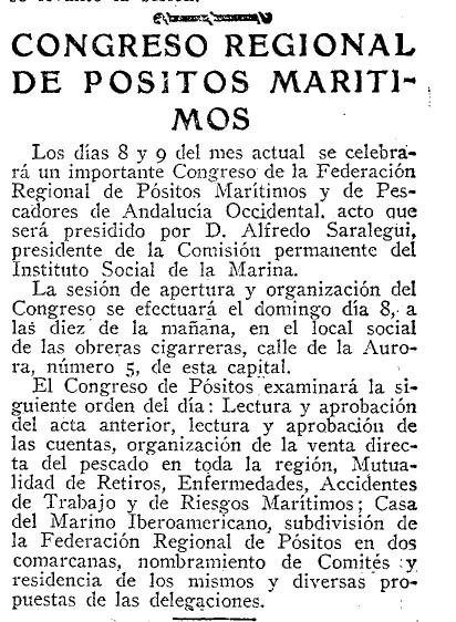 Congreso de la Federación de Pósitos Marítimos y de Pescadores de Andalucía Occidental; Alfredo Saralegui; Instituto Social de la Marina; Mutualidad; venta directa; Tarifa; Barbate; CONIL; San Fernando; Cádiz; Puerto de Santa María; Sanlúcar de Barrameda; Sevilla; Huelva; Ayamonte; Isla Cristina.